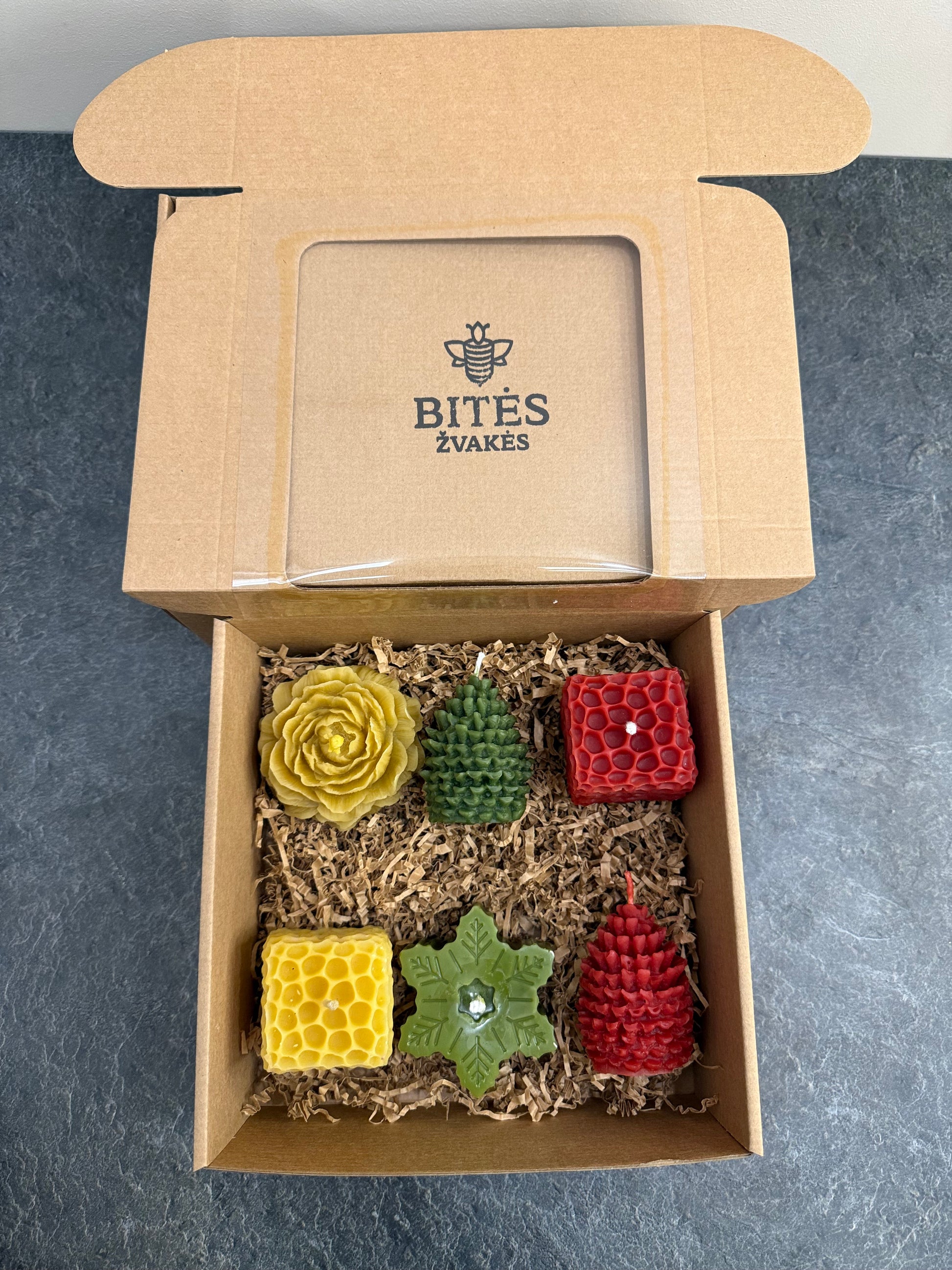 Kalėdinis žvakių rinkinys „Kalėdų pasaka“ – šešios skirtingų formų bičių vaško žvakės, kurios namams suteikia jaukios šventinės magijos. Rinkinį sudaro gėlės, eglučių, snaigės ir korių rašto kubelių formos žvakės geltonu, žaliu ir raudonu atspalviais.